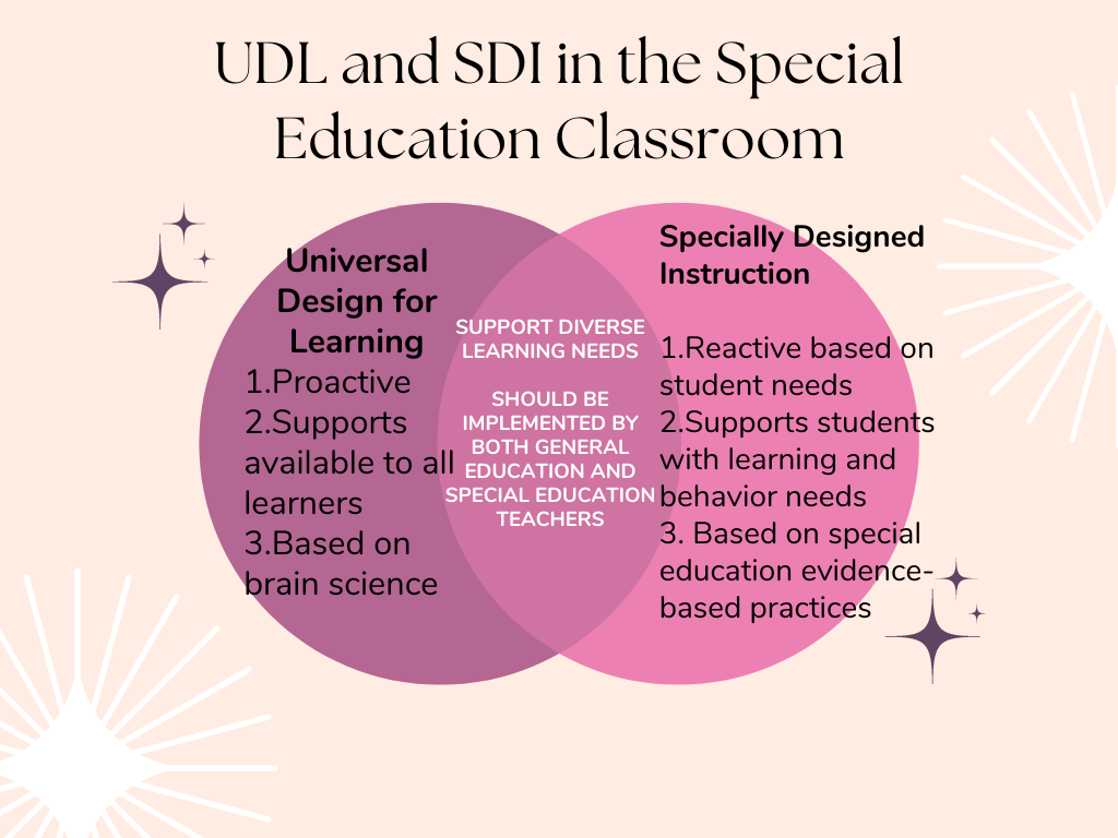 As special educators, we are tasked with ensuring that all students have their needs met in the classroom. We can do this through pairing the use of the Universal Design for Learning (UDL) for all learners with specially designed instruction (SDI) for students with unique learning needs. UDL is based on brain research and offers students multiple means of engagement, multiple means of representation, and multiple means of action and expression. For students who need further support as outlined in the IEP, we can use SDI. To better understand how these strategies work together, we recommend looking at the Venn diagram and reviewing the following resources about UDL from the Council for Exceptional Children.