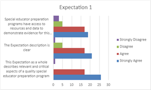 Overwhelmingly, respondents agreed, or strongly agreed, that each of the draft Accreditation Expectations represent a critical aspect of a quality special educator preparation program. In addition to the questions related to each of the draft Accreditation Expectations the survey asked respondents to “describe any critical concepts of a quality special educator program that are not addressed within the draft Expectations” and the responses overwhelmingly affirmed the scope of the Expectations.