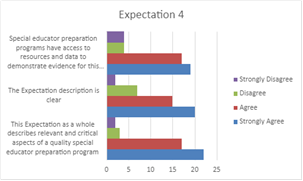 The survey was centered around four draft Accreditation Expectations and whether the respondents thought that each Expectation was relevant, clear, and if a special educator preparation program would have access to data and resources to demonstrate evidence of meeting the expectation. A total of 44 individuals responded over a four-week period representing higher education faculty, in-service P-12 educators, doctoral candidates, and P-12 administrators.
